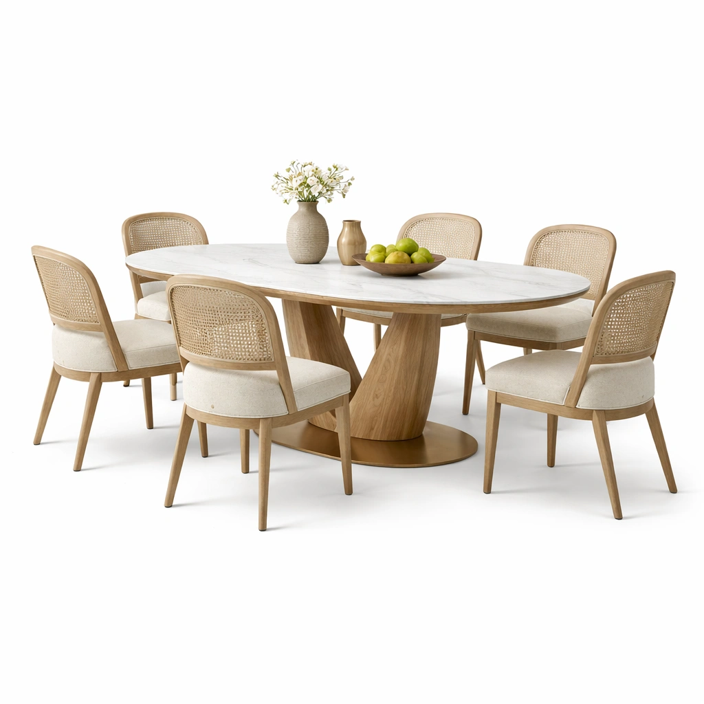 Beschreibung:Dieses elegante Esstisch-Set kombiniert eine helle Holzoptik mit einer modernen Kunstmarmor-Tischplatte und komfortabel gepolsterten St??hlen. Das stilvolle Design passt perfekt in moderne Essbereiche und schafft eine warme, einladende Atmosph?re.